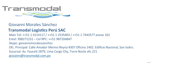 We have the honor to announce that Transmodal Logistics Peru SAC join GLA family as Peru membership. If you need service from/to Peru, you can contact Giovanni Morales Sanchez, b...